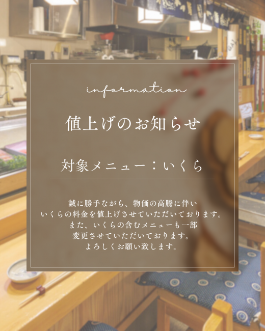 お知らせ 値上げのお知らせ 2025/12/22 誠に勝手ながら、物価の高騰に伴いいくらの料金を値上げさせていただいております。また、いくらの含むメニューも一部変更させていただいております。よろしくお願い致します。⌚営業時間⇒17:30〜21:30(L.O.21:00)🗓定休日⇒日曜(月に一度臨時休業あり)🌐予約⇒公式ホームページ🅿️駐車場⇒9台📍住所⇒福井県福井市中央2丁目6-4 前へ 次へ